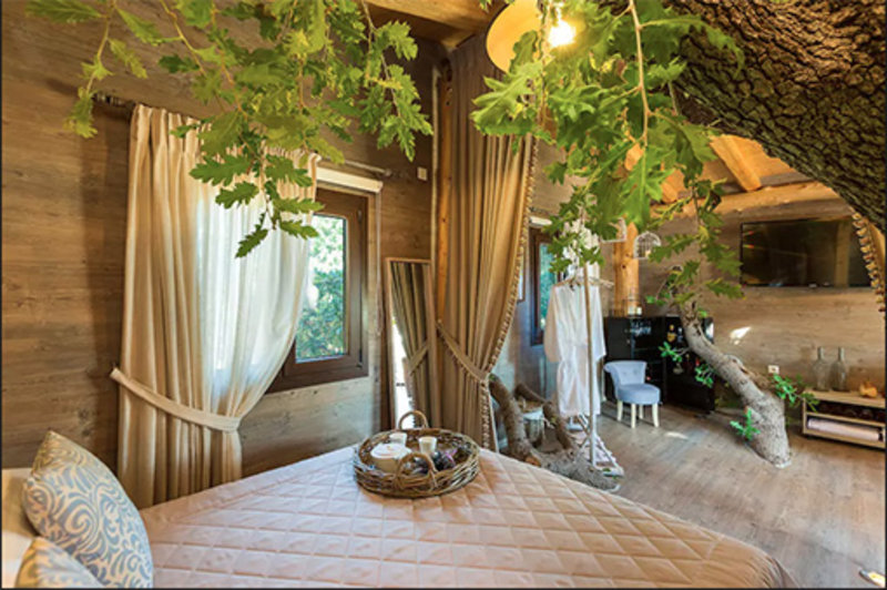 Ένα ακόμη δεντρόσπιτο που δεν έχει να ζηλέψει τίποτα από δωμάτια ξενοδοχείων. Ελαιόδεντρα, βελανιδιές και γκαζόν αποτελούν το ιδανικό σκηνικό για το σπιτάκι.