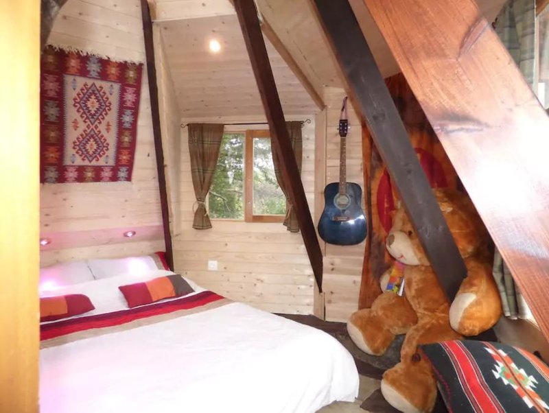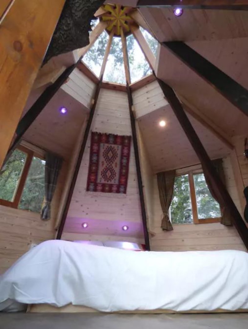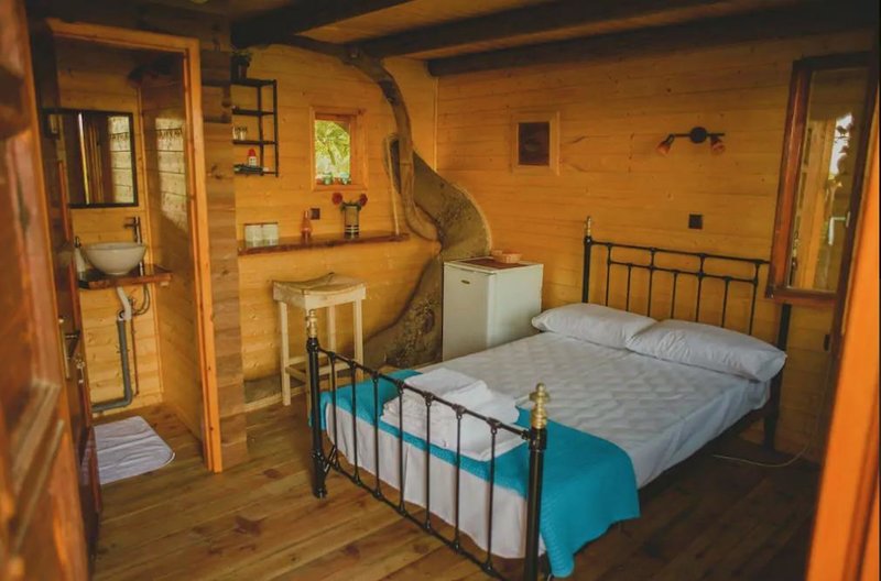Το δεντρόσπιτο περιλαμβάνει διπλό κρεβάτι, μπάνιο και μικρή κουζίνα.