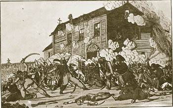 «Με ποτάμια από αίματα/ καταχτιέται η λευτεριά./`Η στη μάχη θα πέσουμε/ ή θα ζήσουμε λεύτεροι πια./ Κάτω όλοι οι βασιλιάδες,/ τύραννοι, σύμβολα σκλαβιάς/(...)».