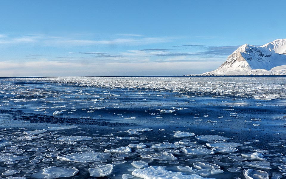Η θάλασσα στο φιόρδ στις ακτές του οποίου βρίσκονται οι κύριες κοινότητες του Σβάλμπαρντ (Isfjorden) στις 31 Μαρτίου. Έως τα μέσα της προηγούμενης δεκαετίας, η διέλευση με πλοίο ήταν ανέφικτη τουλάχιστον μέχρι τα τέλη Μαΐου. (Φωτογραφία: Γιάννης Παλαιολόγος)