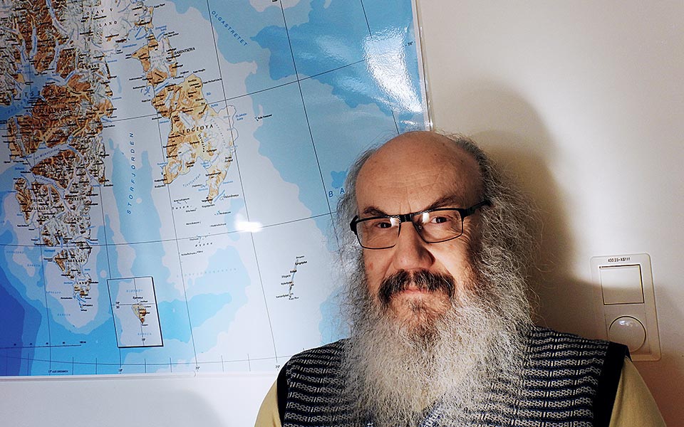 Ο Κιμ Χολμέν του Πολικού Ινστιτούτου της Νορβηγίας στο γραφείο του, στο Πανεπιστημιακό Κέντρο του Σβάλμπαρντ. (Φωτογραφία: Γιάννης Παλαιολόγος)