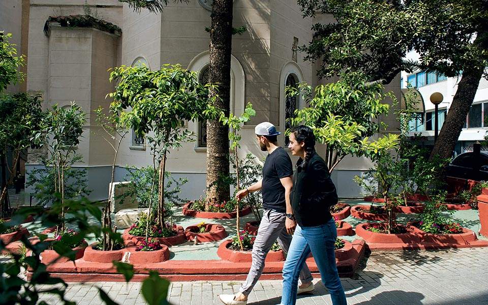 Περαστικοί διασχίζουν τον περίβολο της εκκλησίας, με τα περιποιημένα από τον ίδιο τον πατέρα Θεοδόσιο παρτέρια.