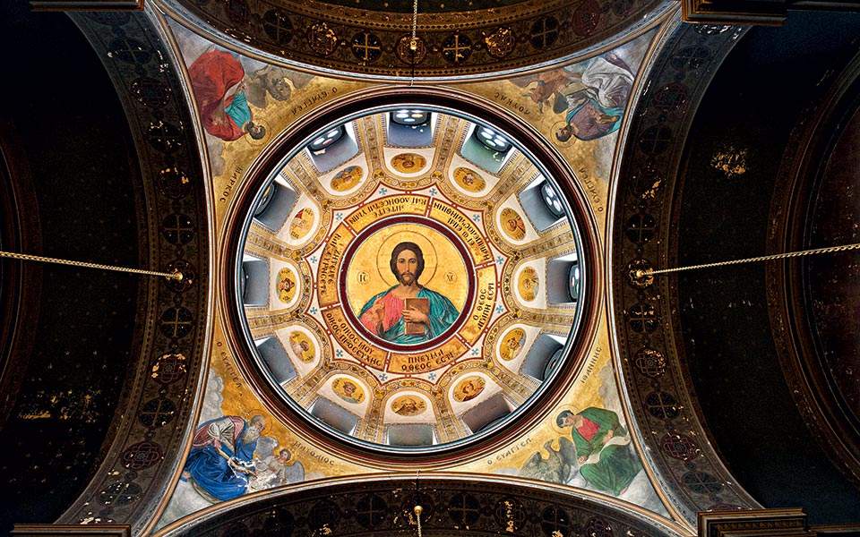Η εξαιρετική τοιχογραφία του Παντοκράτορα δεσπόζει στον τρούλο του ιστορικού ναού.