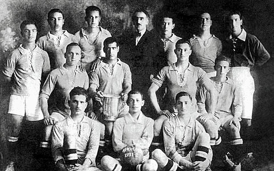 Η ποδοσφαιρική ομάδα του Απόλλωνα, πρωταθλήτρια Σμύρνης 1921-22. Όρθιος στο κέντρο διακρίνεται ο πρόεδρός της, Δημήτριος Μαρσέλλος (1922).