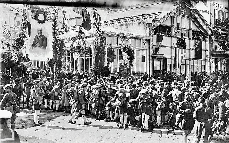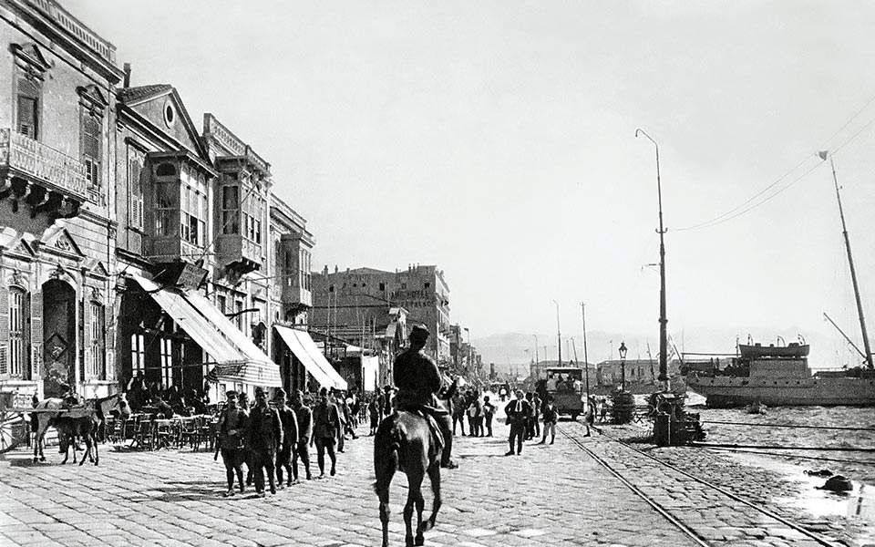 Έλληνας έφιππος στρατιώτης διασταυρώνεται με περίπολο στην προκυμαία, λίγο πριν από το καφενείο «Νέος Ποσειδών» (1919).