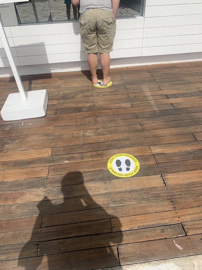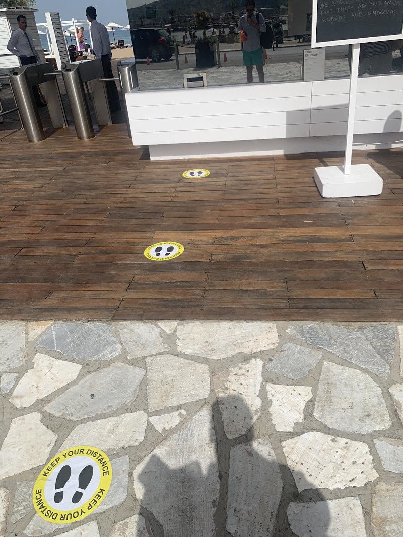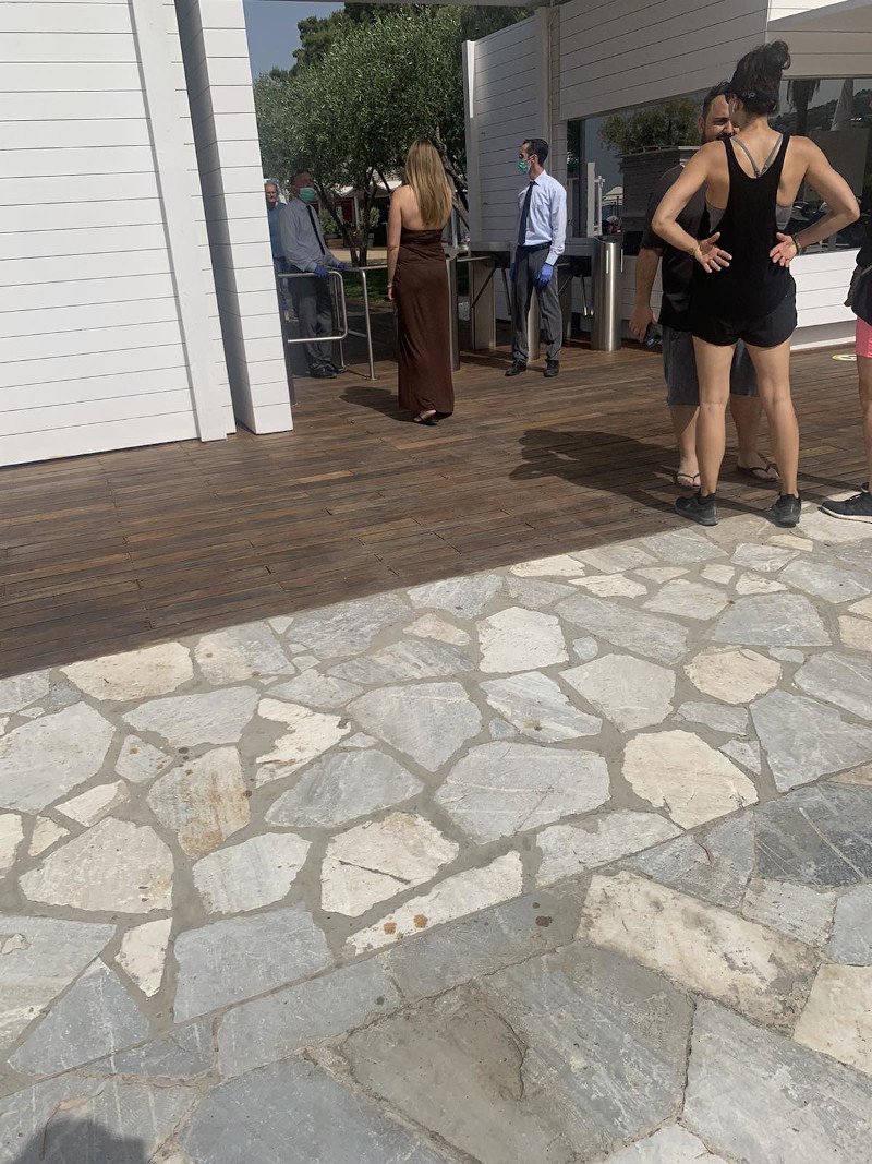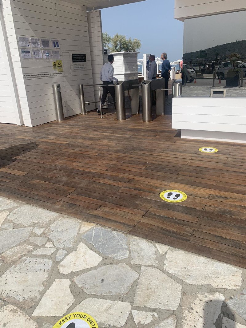 Ειδικότερα, στην είσοδο όλοι φορούν μάσκες παρά τις υψηλές θερμοκρασίες που επικρατούν, ενώ έχουν τοποθετηθεί και ειδικά αυτοκόλλητα στο έδαφος ώστε να τηρούνται οι απαραίτητες αποστάσεις.