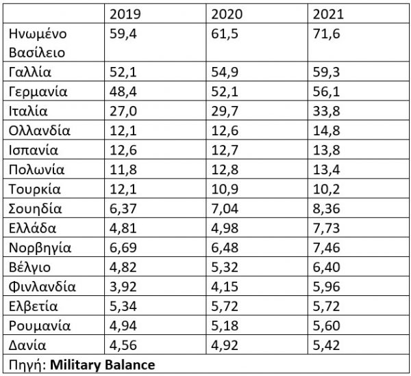 Ο πόλεμος αυτός υποχρεώνει την πλειονότητα των χωρών της Ευρωπαϊκής Ένωσης και του ΝΑΤΟ να αυξήσουν τις στρατιωτικές τους δαπάνες. Αυτή τη διαδικασία τη βλέπουμε πρόσφατα στη Γερμανία. Η αλήθεια είναι ότι το κόστος υπεράσπισης του ελεύθερου κόσμου θα είναι υψηλό και θα μας βάλει σε μια διαδικασία χρέους και πληθωρισμού. Ο προϋπολογισμός της άμυνας των χωρών της Ευρώπης τα τελευταία τρία χρόνια είναι ο ακόλουθος (σε δις δολάρια).