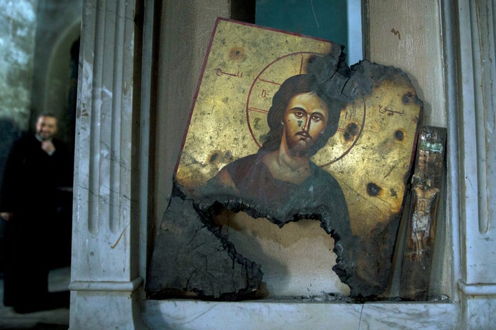Μια μισοκαμένη εικόνα του Χριστού τοποθετείται δίπλα σε έναν τοίχο σε μια ελληνορθόδοξη εκκλησία στη Μααλούλα της Συρίας, Πέμπτη 3 Μαρτίου 2016. Η Maaloula, μια αρχαία χριστιανική πόλη 60 χιλιόμετρα βορειοανατολικά της Δαμασκού, άλλαξε χέρια αρκετές φορές κατά τη διάρκεια του πολέμου. Οι ιστορικές εκκλησίες της λεηλατήθηκαν από τους τζιχαντιστές και τα κτίρια της που είναι διάτρητα από θραύσματα αντικατοπτρίζουν τις σφοδρές μάχες που κατέστρεψαν την πόλη