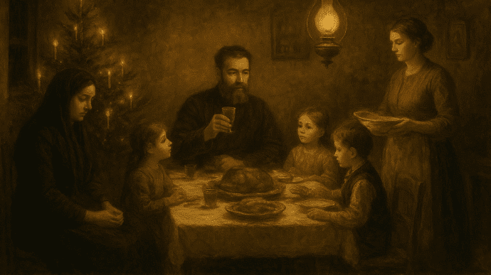 Μετά τη Θεία Λειτουργία, «ευθύς τραπέζι στρώνουσι» κατά το άσμα των Χριστουγέννων. Τα τέκνα κάθονται φρόνιμα «όσον ουδέποτε» με «την αρτοφυή κοκκώναν, ην και εδάγκασαν ήδη εκεί εις τα στρογγυλὰ μάγουλα», ενώ το χοιρινό στη σούβλα «λάμπει εν μέσω νεφών καπνού ελισσομένου εν τη εστία και ενίοτε σταγών παχεία του λίπους σβήνει την ανθρακιάν [θράκα], ως το ύδωρ ισχυρού υετού δια της καπνοδόχου καταπίπτον».