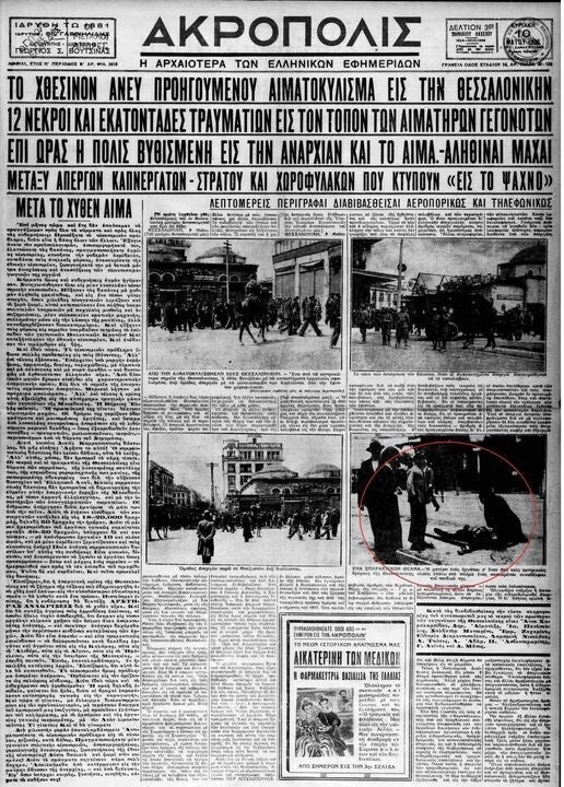 Η εμβληματική φωτογραφία της Κατίνας Τούση να θρηνεί πάνω από το νεκρό σώμα του γιου της, Τάσου, δολοφονημένου από τις δυνάμεις καταστολής κατά την αιματηρή καταστολή των εργατικών κινητοποιήσεων στη Θεσσαλονίκη. Ο Τάσος Τούσης, αυτοκινητιστής και εργάτης, έπεσε νεκρός στη γωνία Εγνατίας και Συγγρού. Η εικόνα αυτή, που έκανε τον γύρο του κόσμου, ενέπνευσε τον Γιάννη Ρίτσο να γράψει τον «Επιτάφιο» – έναν ποιητικό θρήνο που έγινε σύμβολο του λαϊκού πένθους και της κοινωνικής διεκδίκησης.