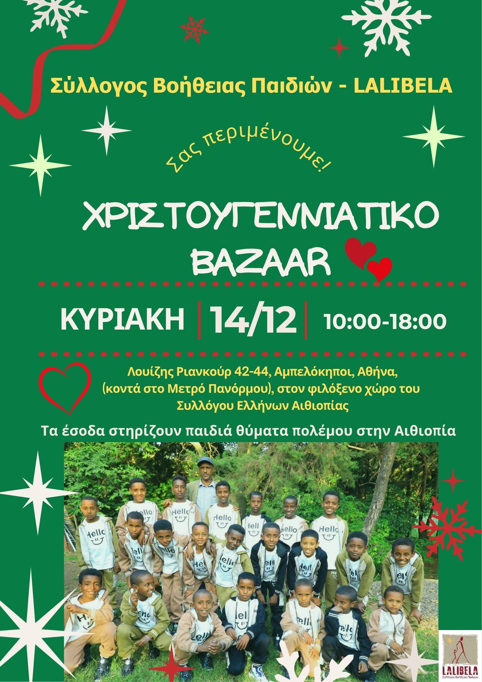 Χριστουγεννιάτικα στολίδια, χειροποίητα γλυκά και ζυμαρικά, αξεσουάρ, κοσμήματα, φουλάρια, είδη σπιτιού και μοναδικά ethnic δώρα από την Αιθιοπία μπορεί να βρει ο επισκέπτης του Χριστουγεννάτικου bazaar στον φιλόξενο χώρο του Συλλόγου Ελλήνων Αιθιοπίας – Lalibela (Λουίζης Ριανκούρ 42-44, Αμπελόκηποι – κοντά στο Μετρό Πανόρμου) που πραγματοποιείται την Κυριακή 14 Δεκεμβρίου από τις 10 π.μ. ως τις το 6 μ.μ. από τον Σύλλογο Βοήθειας Παιδιών – Lalibela.